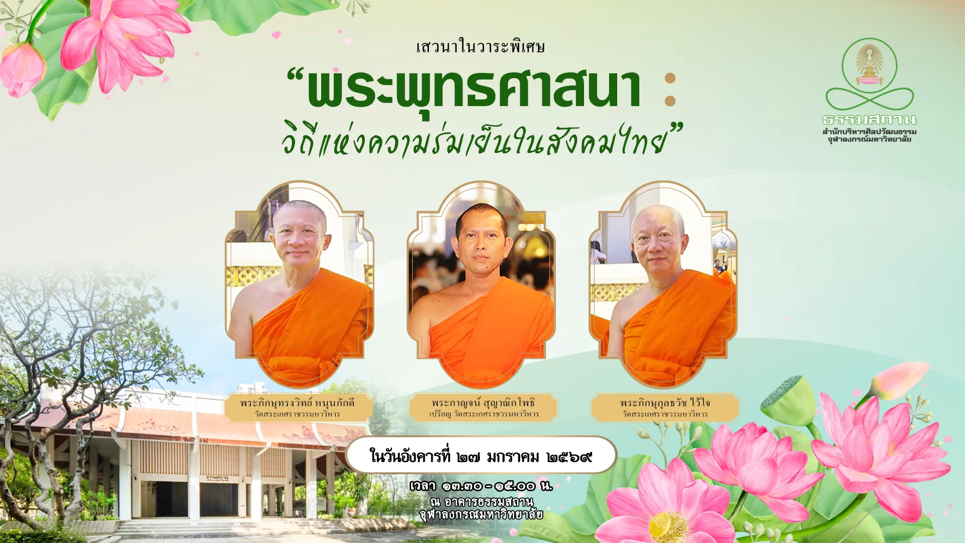 ขอเชิญนิสิต คณาจารย์ และ บุคลากรจุฬาลงกรณ์มหาวิทยาลัย รวมถึงพุทธศาสนิกชนทุกท่าน เข้าร่วมกิจกรรม “บุญสุนทาน” วันศุกร์ที่ ๓๐ มกราคม ๒๕๖๙