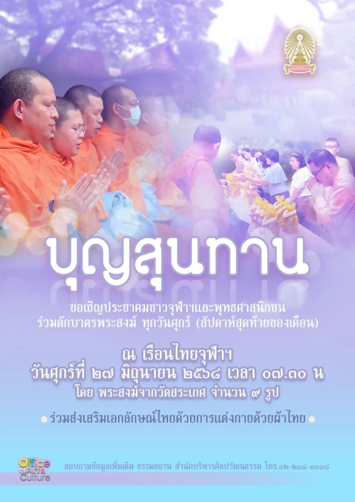ขอเชิญนิสิต คณาจารย์ และบุคลากรจุฬาลงกรณ์มหาวิทยาลัย รวมถึงพุทธศาสนิกชนทุกท่านเข้าร่วมกิจกรรม “บุญสุนทาน” กิจกรรมตักบาตร ณ เรือนไทย จุฬาฯ (ทุกศุกร์สุดท้ายของเดือน)